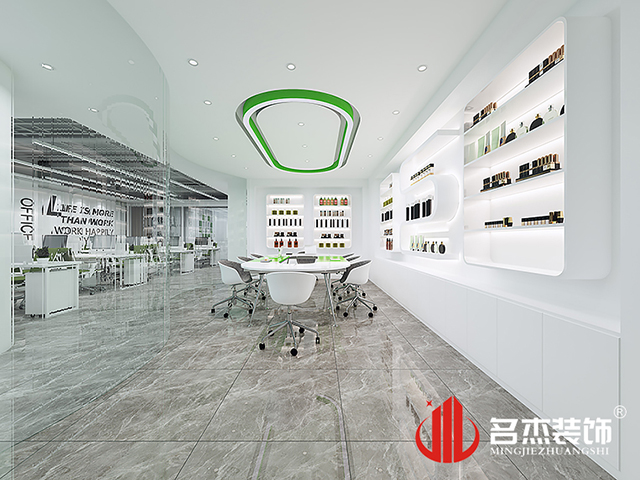 設(shè)計說明:整體設(shè)計以白色作為主設(shè)計基調(diào),加以綠色作為點綴色,讓空間的綠色環(huán)保感覺一下子就出來了。而且加入圓弧形元素能夠讓空間更加有設(shè)計層次感。在展廳區(qū)域使用玻璃隔墻來增加整體空間的通透感,同時能夠增強視覺上的觀感。