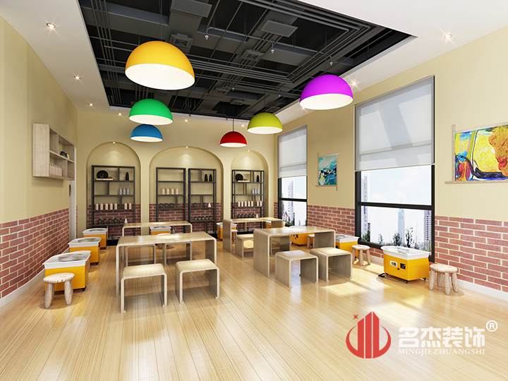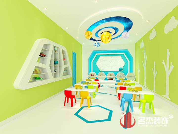 設計說明:本次教育培訓機構裝修設計案例設計師設計時前臺的主色系以蘋果綠為主,淺藍色與橙色為輔色系,通過鮮艷橙色去吸取客戶群體眼球,給人煥然一新的新鮮感,讓孩子更貼近自然,給孩子一種置學習于家的感受。 課室以藍天白云,綠地為主風格,讓孩子于上課環境也置身于大自然的懷抱中,從而給予孩子一種輕松而自然舒服的學習環境。音樂課室則以藍天白云、綠色自然為主,讓人以冷靜的心態去聆聽音樂,通過音符吊燈的點綴,從而讓音樂的學習氛圍更具特色,美術課室通過藍天白云的天花吊頂,加以鮮艷的黃色給予孩子一種既自然又活躍的學習氛圍,墻身的黑板給予孩子進行粉筆涂鴉,從而開發孩子對美術的興趣愛好,解放孩子天馬行空的天性。陶藝室與美術1室設計空間,主要以鄉土氣息的環境營造出原始生態氛圍,利用活動隔斷開發2個空間,讓家長也可以參與與孩子創造最美的同年回憶與作品 。科學室主要以藍色科技感為主,通過天花的宇宙燈膜造型吸引孩子對科技的探索興趣。