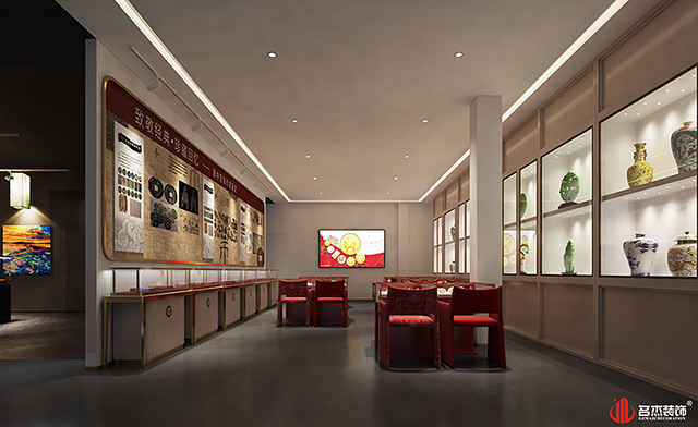 設計說明:設計團隊在前臺區域使用圓形吊頂,輔以具有線條美的燈具,配合中式傳統的配色來打造這個前臺區域,讓這個區域看起來帶有濃濃的新中式風格。在展廳區域,則是使用仿燈籠造型的燈具,配合展廳的展品,來讓這個空間散發出更加濃郁的傳統氛圍。而在另一個展廳則是使用紅色和藍色,在視覺上形成一種強烈的沖擊感,讓空間看起來更加具有特色。。#廣州辦公室裝修設計公司#